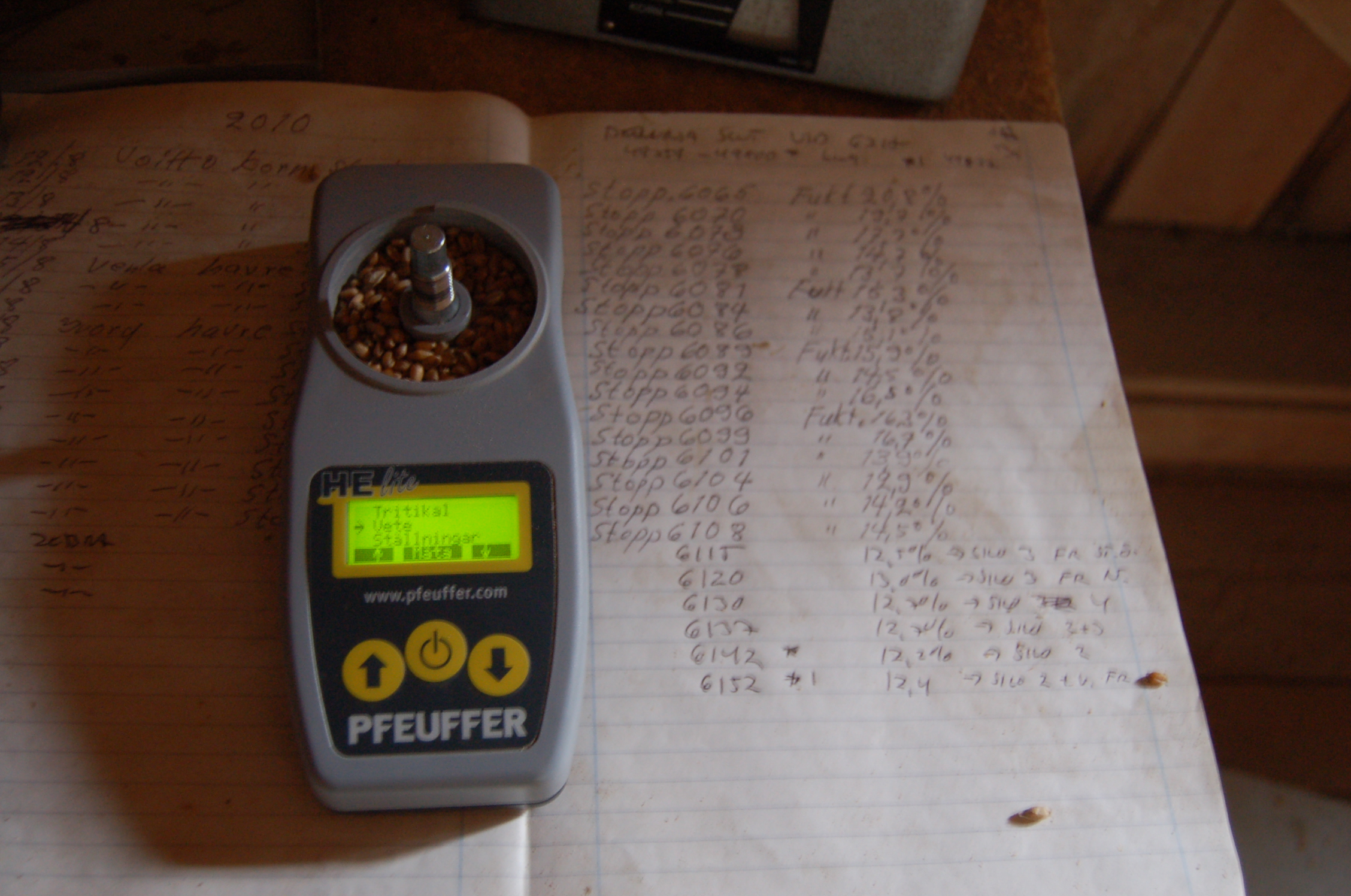 Torrheten mätes med en fuktighetsmätare, den är oumbärlig i alla torkar för att kunna förklara torkningen färdig. Vi använder en typ som krossar spannmålen och mäter fuktigheten även inne i kärnan. Den är både lätt att använda och ger ett mycket tillförlitligt resultat.