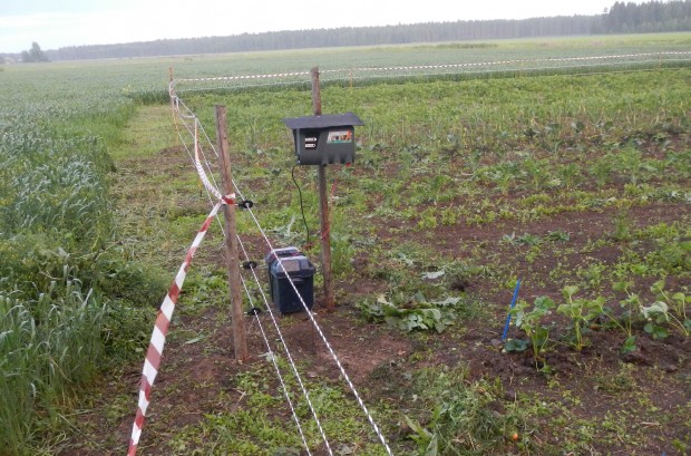 Ja, där borde de vara och helst bli så välstekta att man kan äta upp dem direkt. Men det är förbjudet med så stora strömmar så jag fick nöja mej med en vallare och tråd runt potatislandet som de sjufalt fördömda svinen brukar böka upp. Nu köpte jag en stark elektronisk vallare från Tyskland som ju har lång erfarenhet av vildsvin. På Weidezaun.info finns det en mängd information om hur man bygger elstängsel för olika djur och vildsvinen skall ha de starkaste apparaterna.