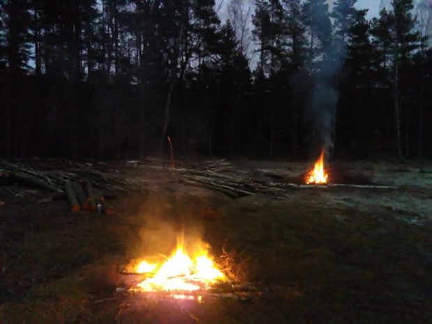 Men, jag började på norrängen. Där har stått en liten teg full med trevligt vedstora stora björkar. Dessa rappade jag omkull på någon dag och sen eldade jag ris några dagar. Det tar ganska mycket tid det där risbrännandet.