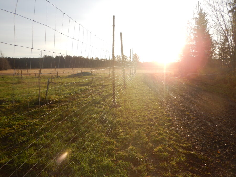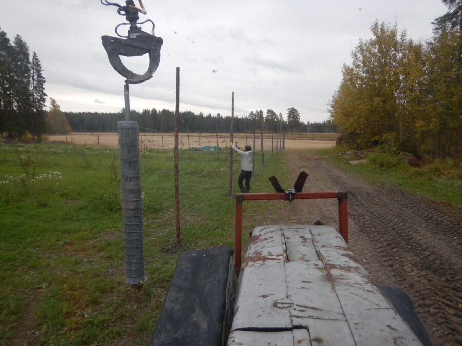 Vi satte två meter högt älgstängselnät runt hela det nya området och fäste vid pålarna som var upp till 10 cm tjocka och fyra meter långa. I hörnen satte vi gamla telefonstolpar som jag borrade hål för med den stora jordborren på 25 cm. Små taggtrådspålar duger inte till nånting. Nätrullen fäste vi vid rotatorn (gripen) och så backade jag och rullade ut nätet tillika. Det gick förvånansvärt fort. Lägg märke till att nätet har mindre maskor lägre ned.