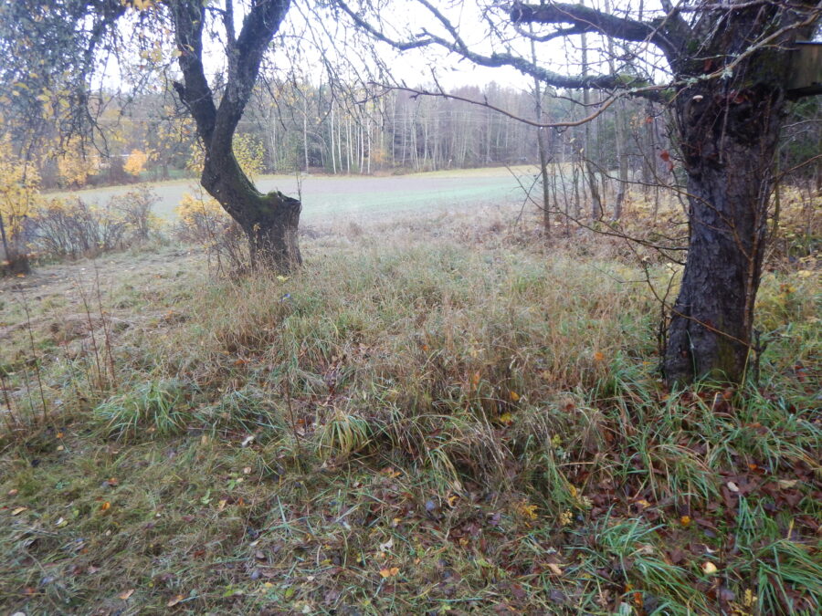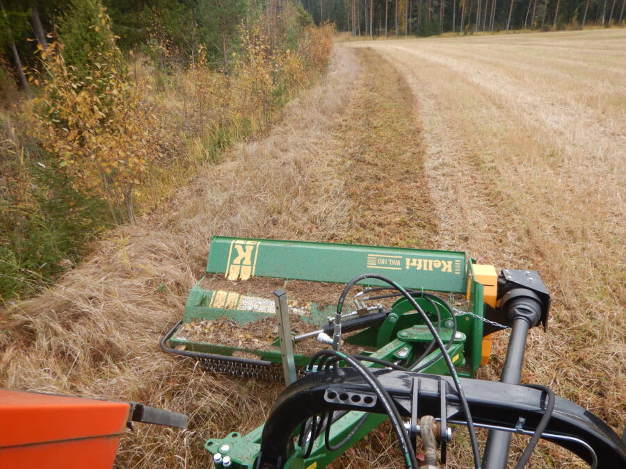 I oktober körde jag också runt åkrarna med den nya sidohacken. Tyvärr hade slyet växt alldeles för mycket på sina ställen så där sågade brorsan omkull den med röjsåg och körde det till vår riisdjäärdsgåård runt äppelträden. Sidhacken (släntklipparen) behövs för att hindra slyet att komma över diket in på åkern. Det räcks över diket men inte in på andra sidan.