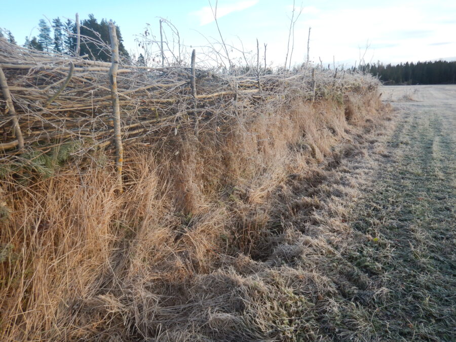 Det blåser mycket kallt och hårt från söder över åkrarna så äppelträden behöver skydd mot blåsten. Henriks familj byggde ett fint vindskydd. Det är helt enkelt två rader med pålar och ris och allt möjligt mellan dem.
