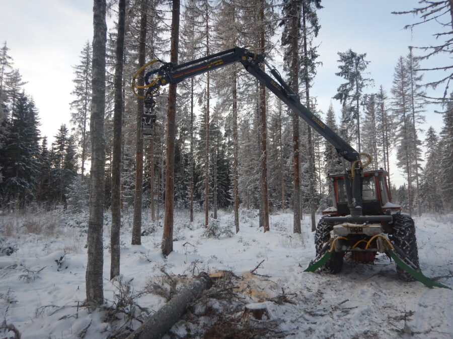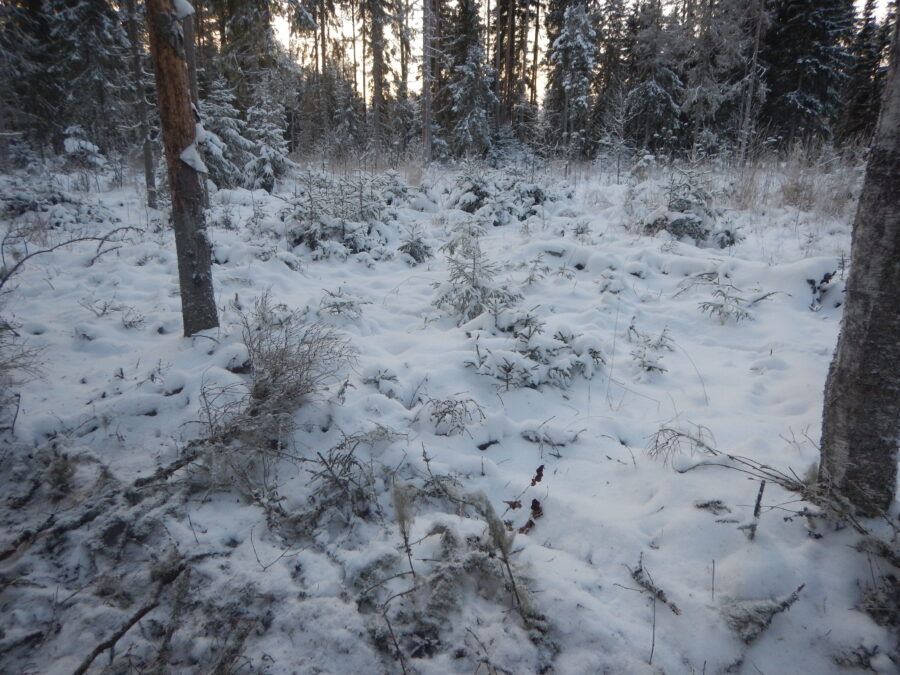 Förutom två dagar med +0,5 grader har det varit kallt hela januari och lär fortsätta åtminstone tio dagar till. Trots det har det inte frusit under snön som är lätt och torr och isolerar bra. Så det måste köras spår hela tiden ännu. Vi har inte mycket snö men den gör det svårt att se stubbar förrän man kör på dem. Trots kylan har det varit mulet mest hela tiden men det kanske kommer litet sol i slutet på veckan.