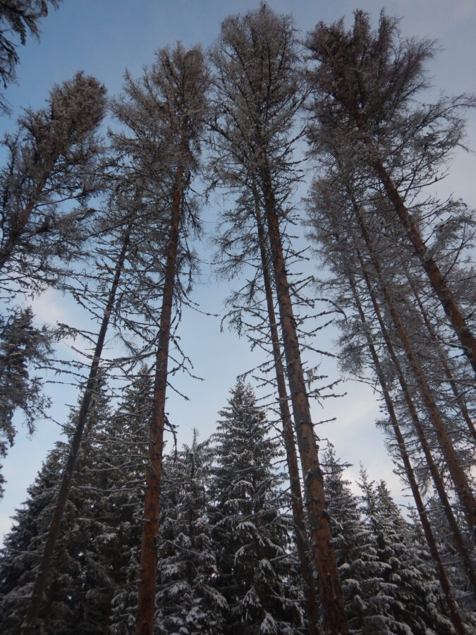 I det stora hela är det fin skogsvinter och då är det bråttom för det kan bara bli sämre. Det mörknar tidigt men man orkar ännu inte med hela dagar fast konditionen nog blivit bättre. Om vi sågar flitigt så kanske vi hinner få några friska granar också till salustock. Tillsvidare har det inte blivit så många.