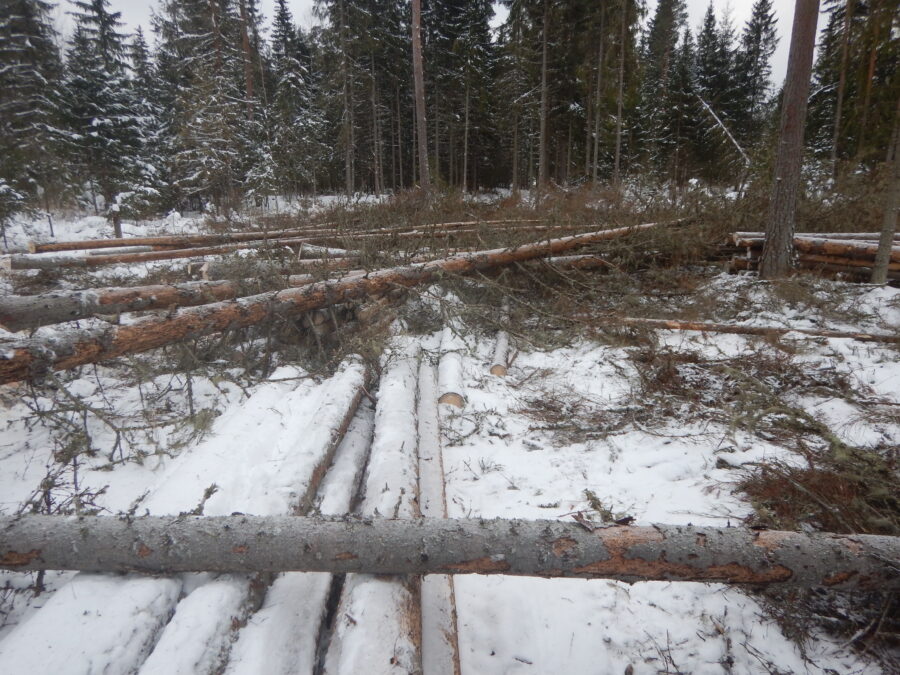 Vi har i stort sett bara sågat ned barkborrsträd hittills – och ett och annat som blåst omkull. Men då har de oftast varit angripna av röta också. Så salustock har det inte blivit. På en gammal åker (före 1908) har vi sågat omkull nästan alla träd för de har varit torra. Det passar bra i år då skogsvägarna har frusit bra för där är vanligen ganska blött.