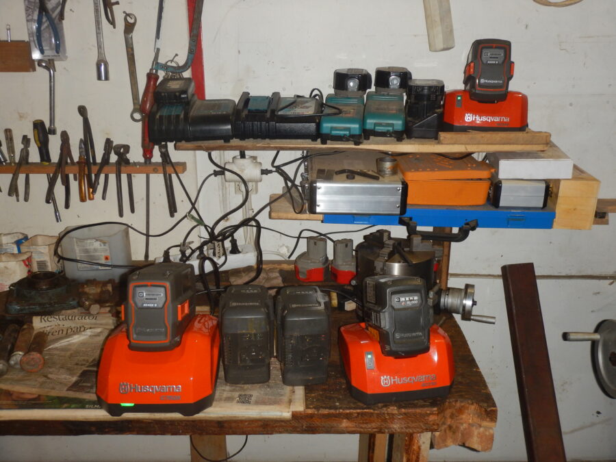 Det kommer allt mer batteridrivna maskiner och de måste ju ha laddare. Jag byggde en laddningshylla för något år sedan men den räcker alls inte till mera. Husqvarna är med i Alliance som arbetar för att samma batteri skall fungera i många olika maskiner. Men Stihl är inte med och det förvånar inte för de har alltid haft sina egna ”standarder”.