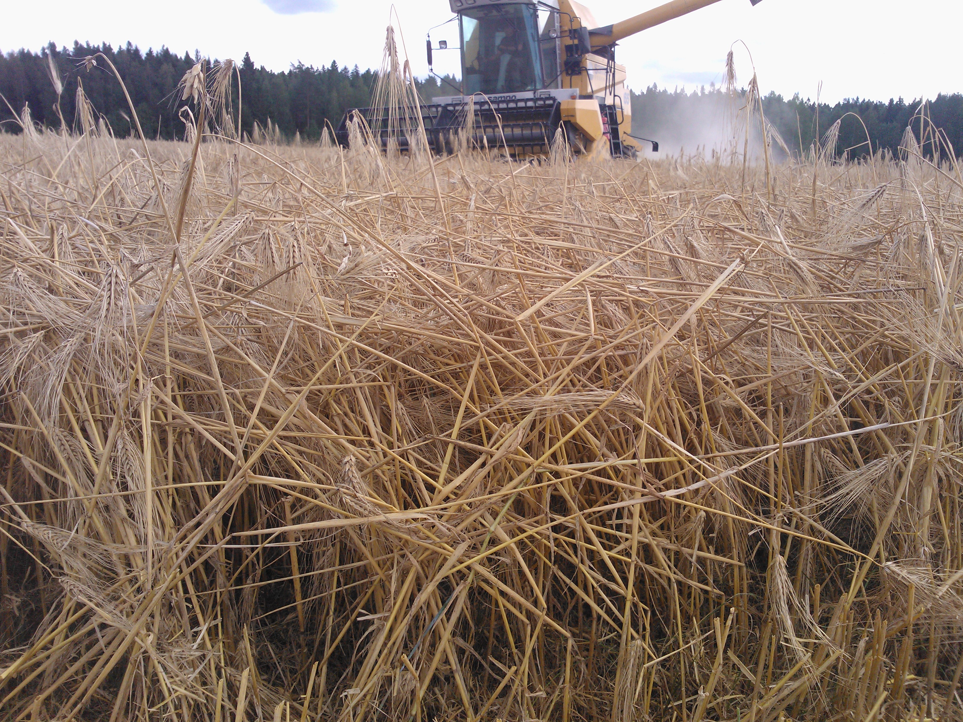 Vid korntröskningen kunde konstateras att en hel del ax frusit under midsommarens nattfroster trots att de då ännu inte gått i ax. Till vänster oskadat ax till höger ett som frostskadats.Uppskattningsvis decimerades skörden med närmare 1000 kg/ha på de åkrar som frusit så man får väl vara tacksam för de 5800 kg/ha som denna åker ändå gav trots frostskadorna.